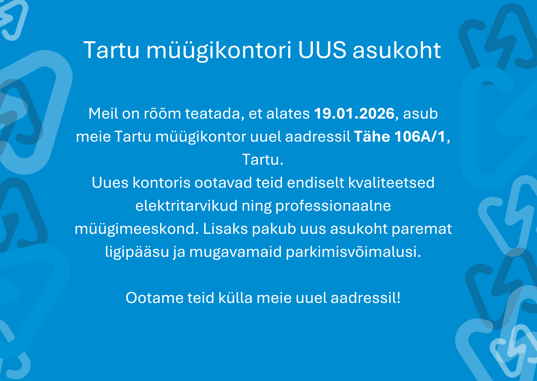 Tartu müügikontori UUS aadress Meil on rõõm teatada, et meie Tartu müügikontor on avatud uuel aadressil Tähe 106A/1.